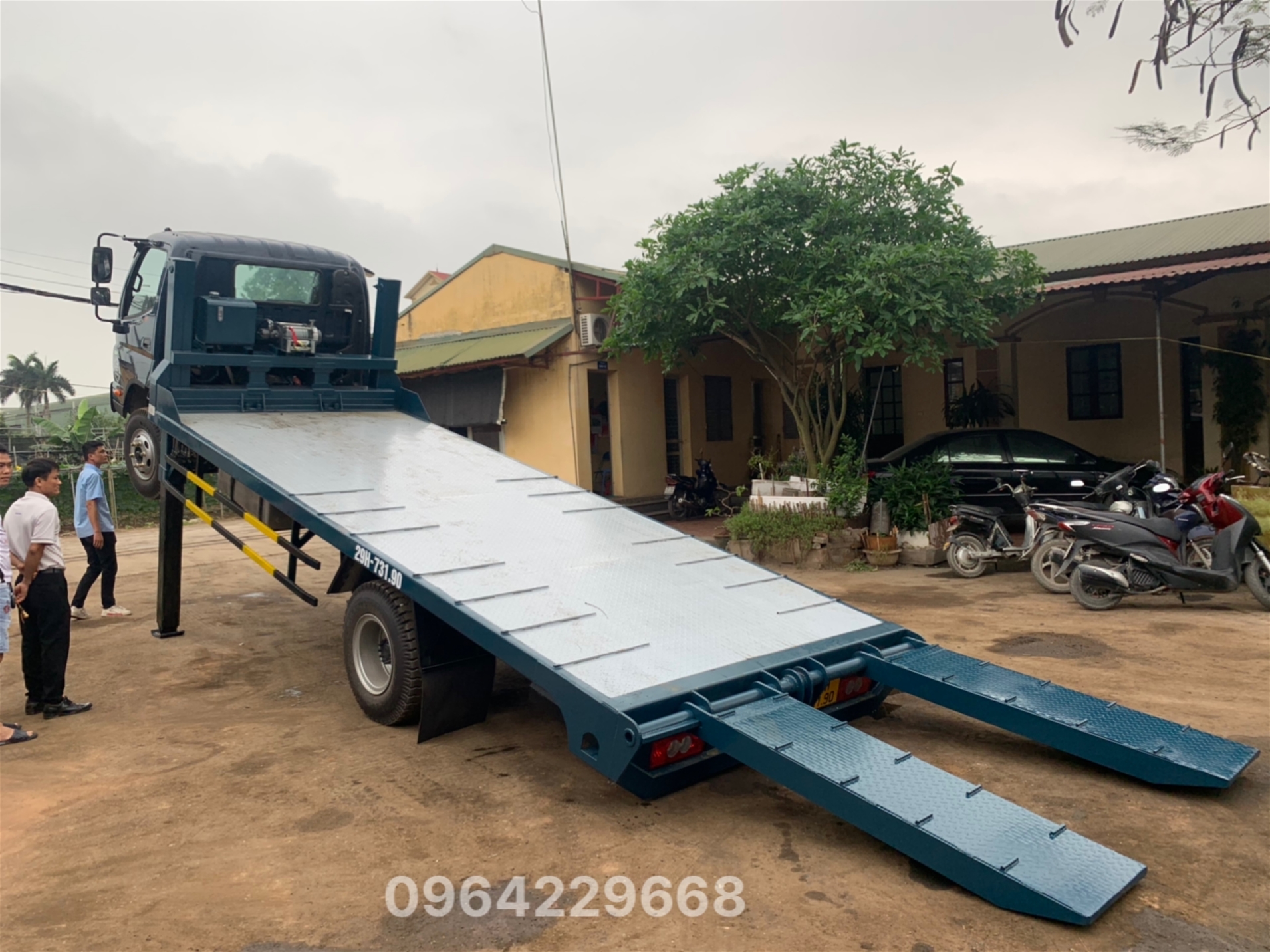 Hệ thống thủy lực dẫn động chân chống nâng hạ đầu xe; cơ cấu neo giữ xe và cầu dẫn kiểu gập;